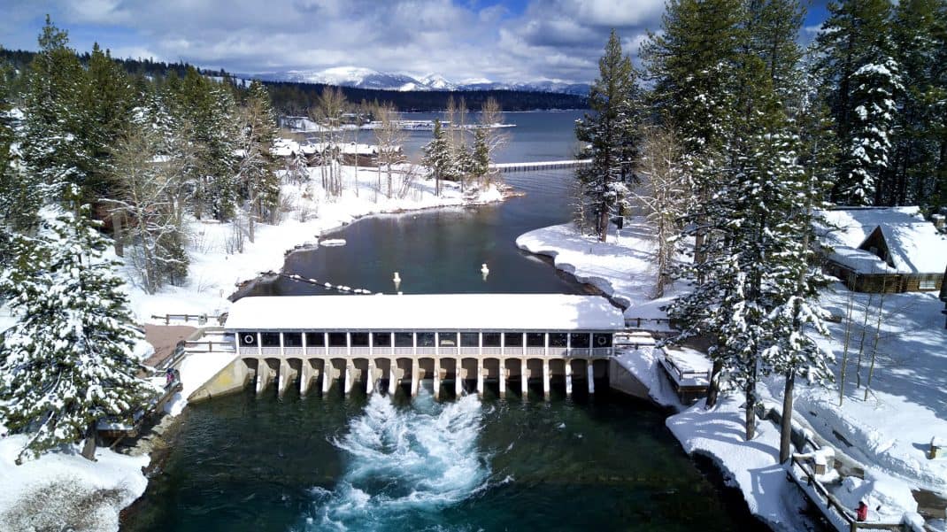 Over the past few years we have been facing a drought here in California and for those of us fortunate enough to live in Lake Tahoe this was very evident. Just go to any beach and you will find your self being able to walk on dry dirt/sand for several hundred feet out before even hitting water. I live in Tahoe City and have been tracking this for the last few years by taking aerial photos of the Tahoe City Dam, Commons Beach and the dock near Commons Beach pictured below.